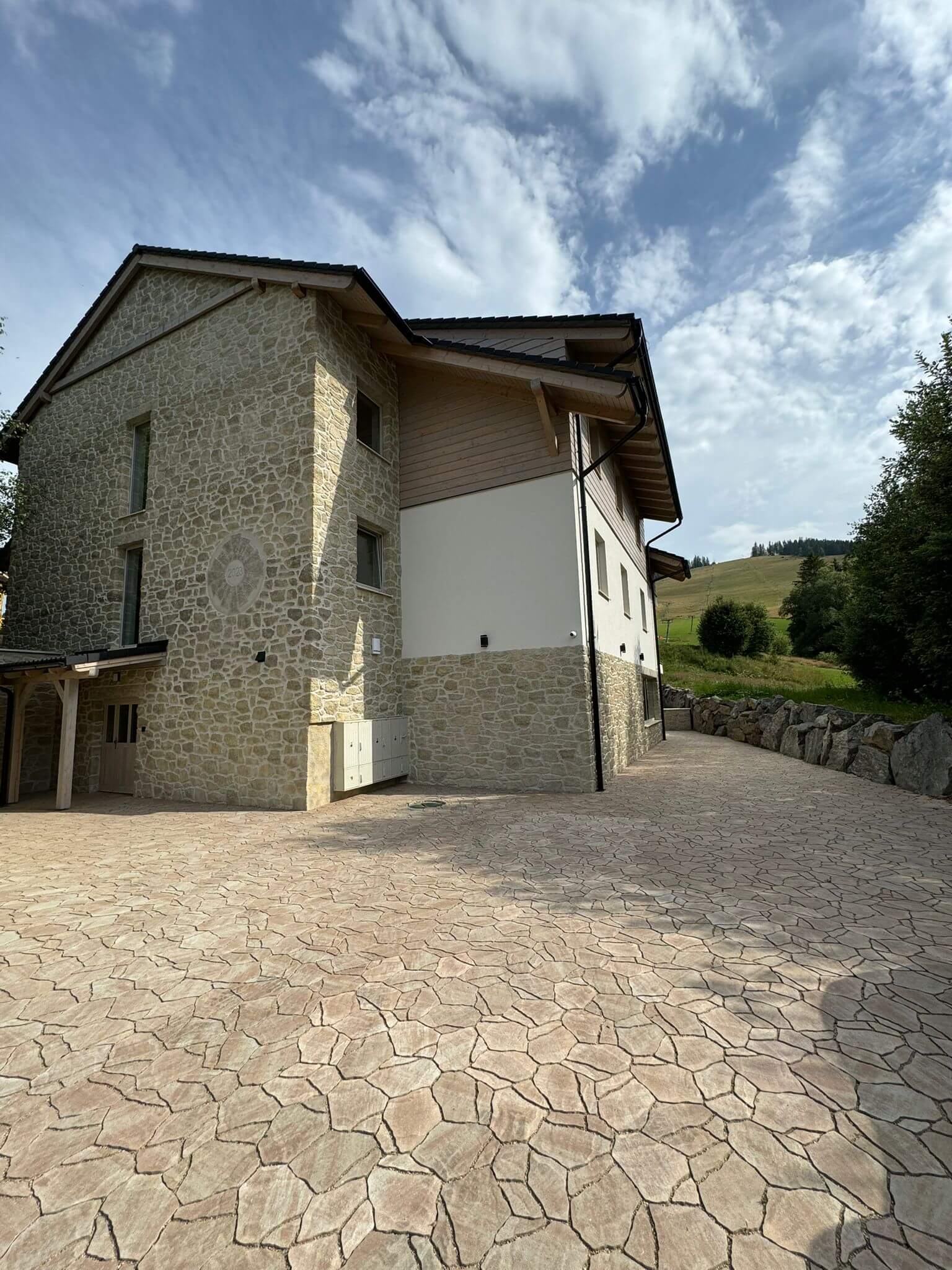 Pokládka zámkovej dlažby okolo apartmánového domu